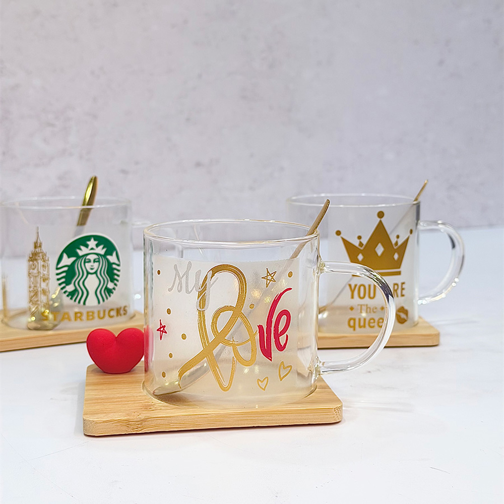 ماگ پیرکس دسته دار با زیره چوبی بامبو بهمراه قاشق طلایی و تزیینات روی استند دقیقا همون هدیه ای که دنبالش بودید