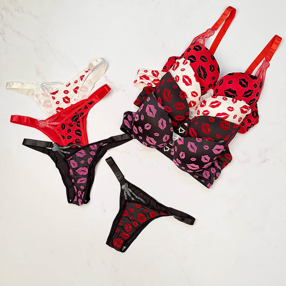 ست لباس زیر شورت و سوتین اسفنجی لب ماتیکی نگین دار کاپ B کد 2077